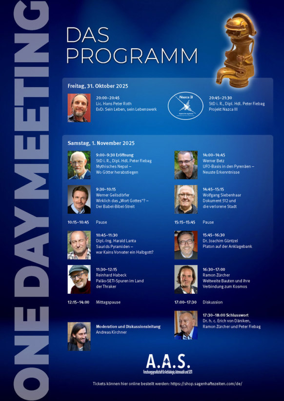 Mit Stolz präsentiert die A.A.S. mit ihrem Geschäftsführer Ramon Zürcher den diesjährigen Kongress – das One-Day-Meeting - am Samstag, 1. November 2025 im Jungfrau Park (ehem. Mystery Park) in Interlaken. Dieser Event ist eine öffentliche Veranstaltung, also nicht nur für A.A.S.ler oder Abonnenten des Magazins “Sagenhafte Zeiten”. Es erwartet Sie ein Füllhorn an neuen Informationen von neun verschiedenen Referenten. Darunter sind altbekannte Namen wie Reinhard Habeck oder Werner Betz, aber auch neue Vortragende, die uns ihr spannendes Thema präsentieren.